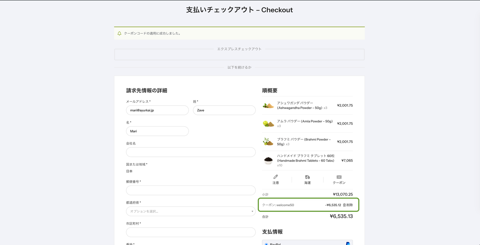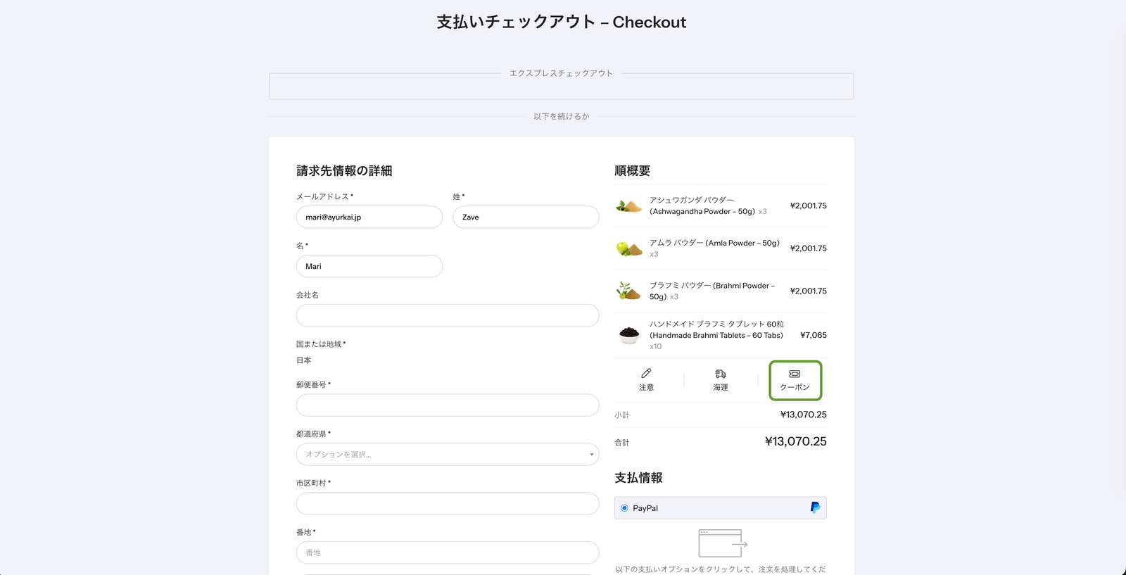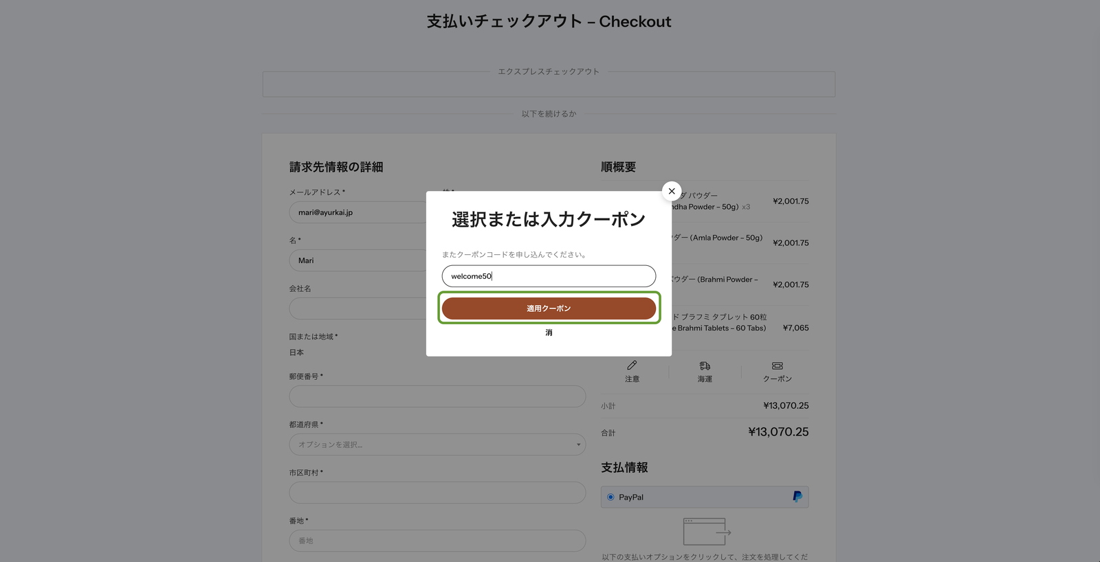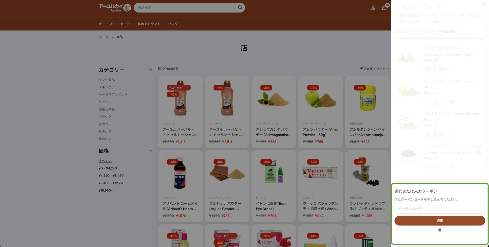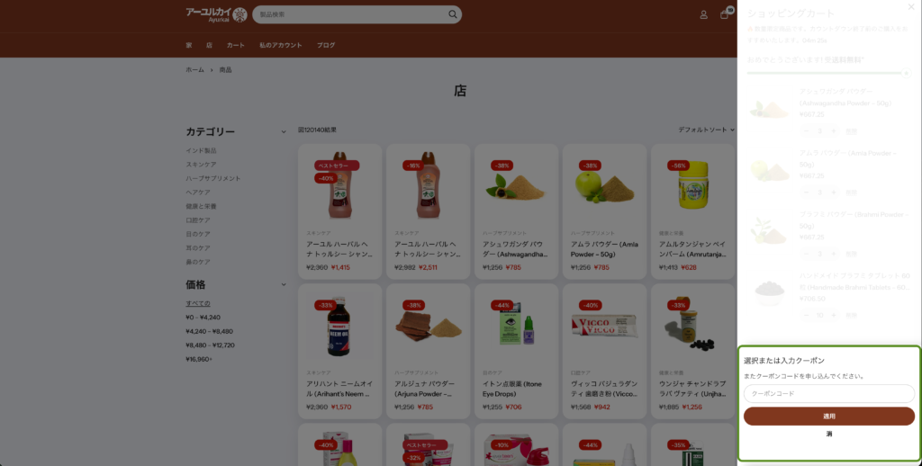 Ayurkai(アユルカイ)では、クーポンコードを使ってお得にお買い物ができます。